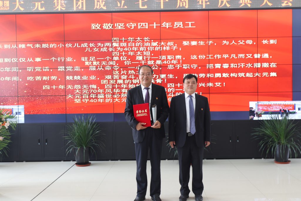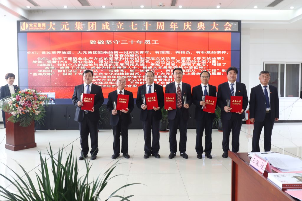 大元集團(tuán)副總裁郝書明(34周年)、工程管理中心主任楊向東(34周年)、華筑通CEO韓秀海(33周年)、大元建業(yè)集團(tuán)常務(wù)副總裁湯長禮(31周年)、大元建業(yè)集團(tuán)總工程師鄭培壯(30周年)、大元建業(yè)集團(tuán)董事長/CEO王連興(30周年)。三公司總經(jīng)理郭啟政為其頒獎(jiǎng)。