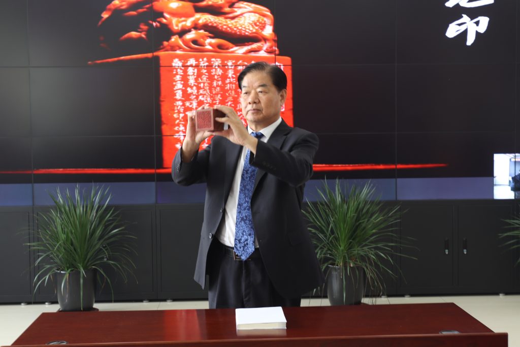 大元集團(tuán)黨委書記、董事局主席李建國親展帥旗。帥旗即大元之魂,是大元發(fā)展、團(tuán)結(jié)、勇敢和統(tǒng)一指揮的象征,寓意百年傳承,大元基業(yè)長青。