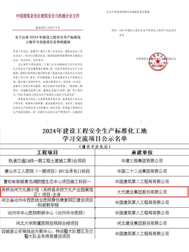 近日,大元集團承建的吳橋運河文化展示館項目榮獲“2024年建設工程安全生產標準化工地學習交流項目”稱號(原“國家AAA級安全文明標準化工地”)。該獎項是全國范圍內建筑安全文明施工的最高獎項,被譽為安全文明施工方面的“魯班獎”。大元集團憑借嚴格的項目安全管理與文明施工要求,連續多年獲此榮譽。